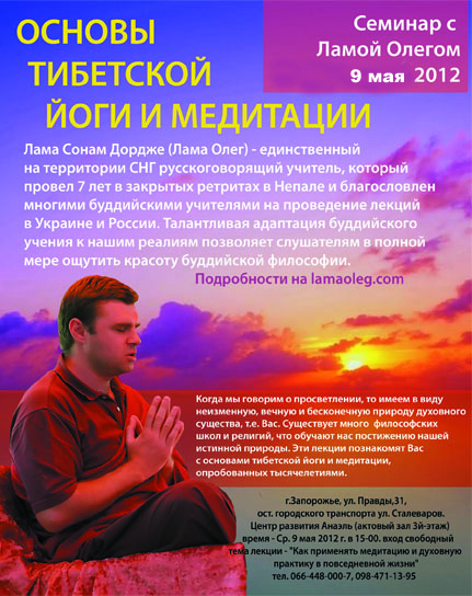 Друзья, рады сообщить о том что 12 - 13 мая будет проходить семинар Ламы Сонам Дордже — Открытие просветления внутри себя. Это будет первым семинаром ламы в Днепропетровске, мы приглашаем вас воспользоваться этой редкой возможностью и пообщаться с эти уникальным человеком и реализованным ламой.