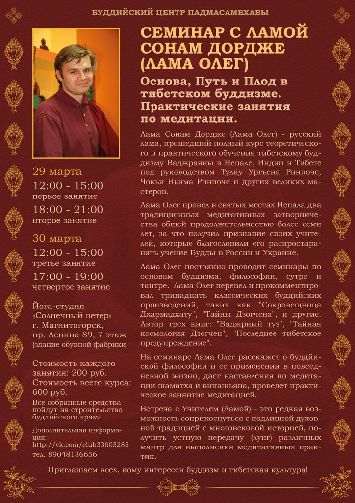 с 29 по 30 марта 2012 г. в Магнитогорске пройдёт семинар Ламы Сонама Дордже (Ламы Олега) на тему: «Медитации шаматха и випашьяна. Объяснение Основы, Пути и Плода духовной практики в буддизме».